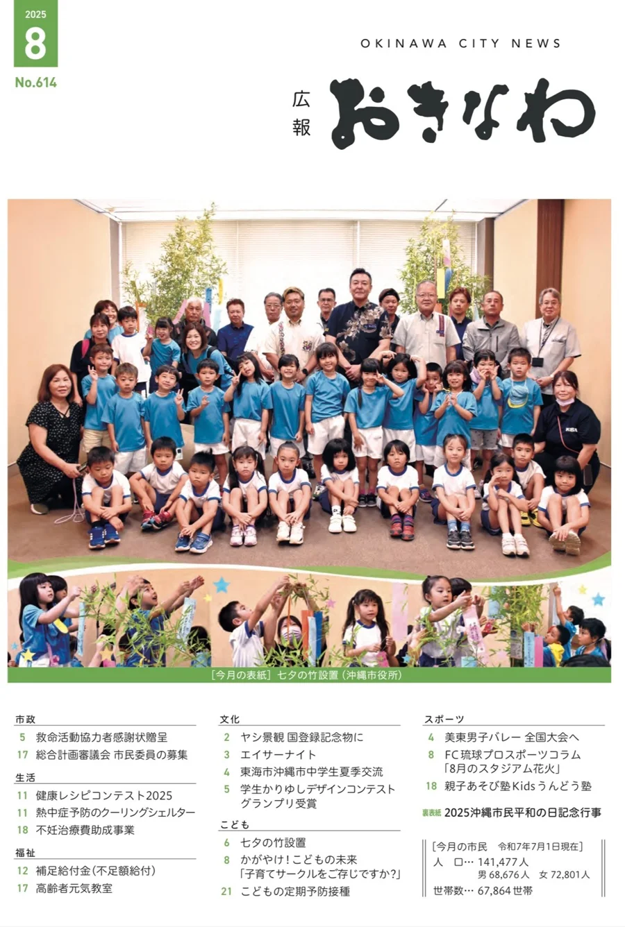 沖縄市役所1階市民ホールに、沖縄市緑花会による七夕の竹が設置され、贈呈式が行われました。