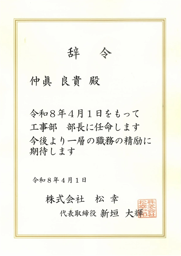 このたび、株式会社 松幸にて長年にわたり現場を支え続けてきた社員が、班長から部長へ昇進いたしました。